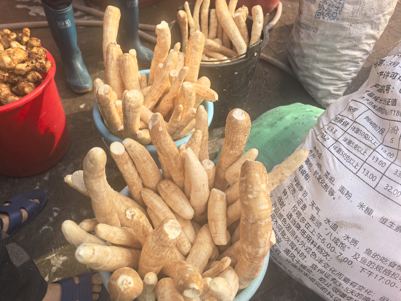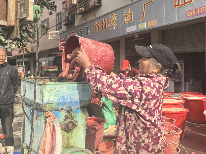 操作碾粉設備的阿姨動作麻利,抬手間便將一桶桶作物倒入研磨機,塊莖瞬間被碾成碎渣,乳白色的漿液順著設備流出,匯入一旁大桶,再加入清水攪拌均勻,靜待后續沉淀。