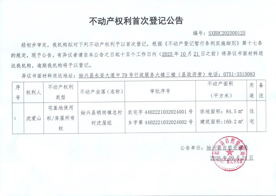 不動產(chǎn)權(quán)利首次登記公告(沈愛山)
