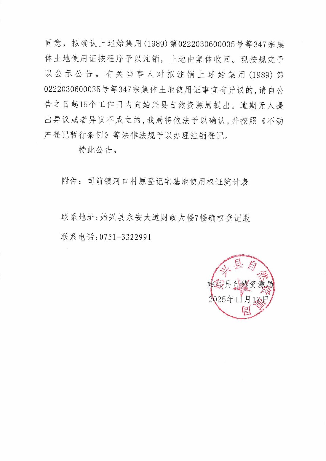 關于注銷始集用(1989)第0222030600035號等347宗產權證書的公告