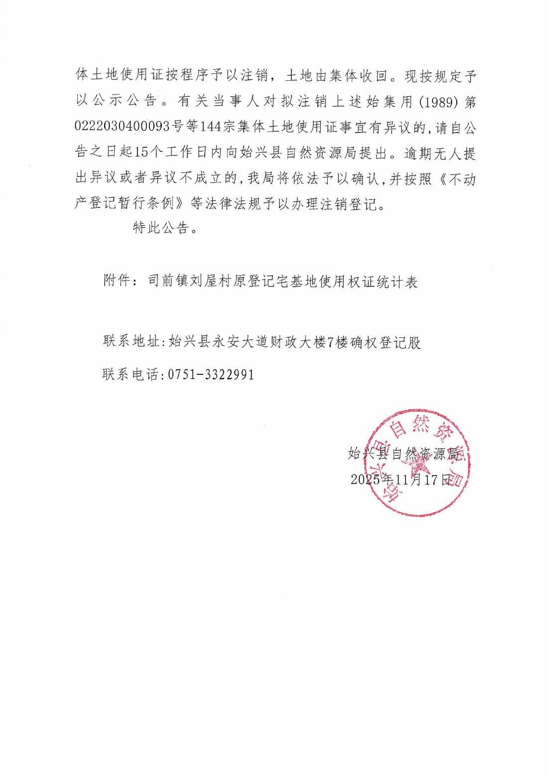 關于注銷始集用(1989)第0222030400093號等144宗產權證書的公告