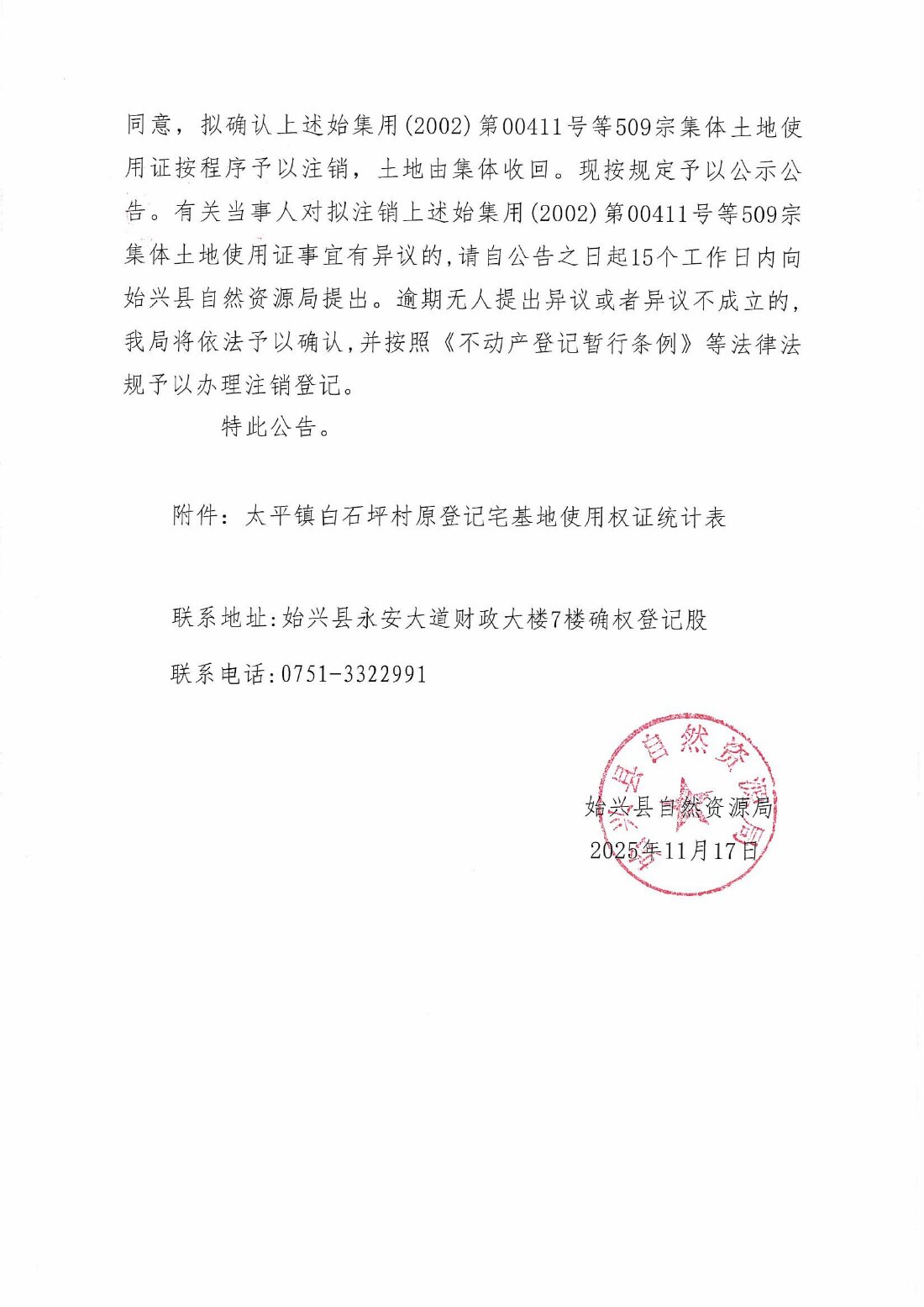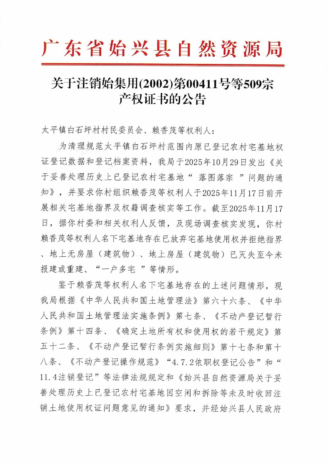關于注銷始集用(2002)第00411號等509宗產權證書的公告