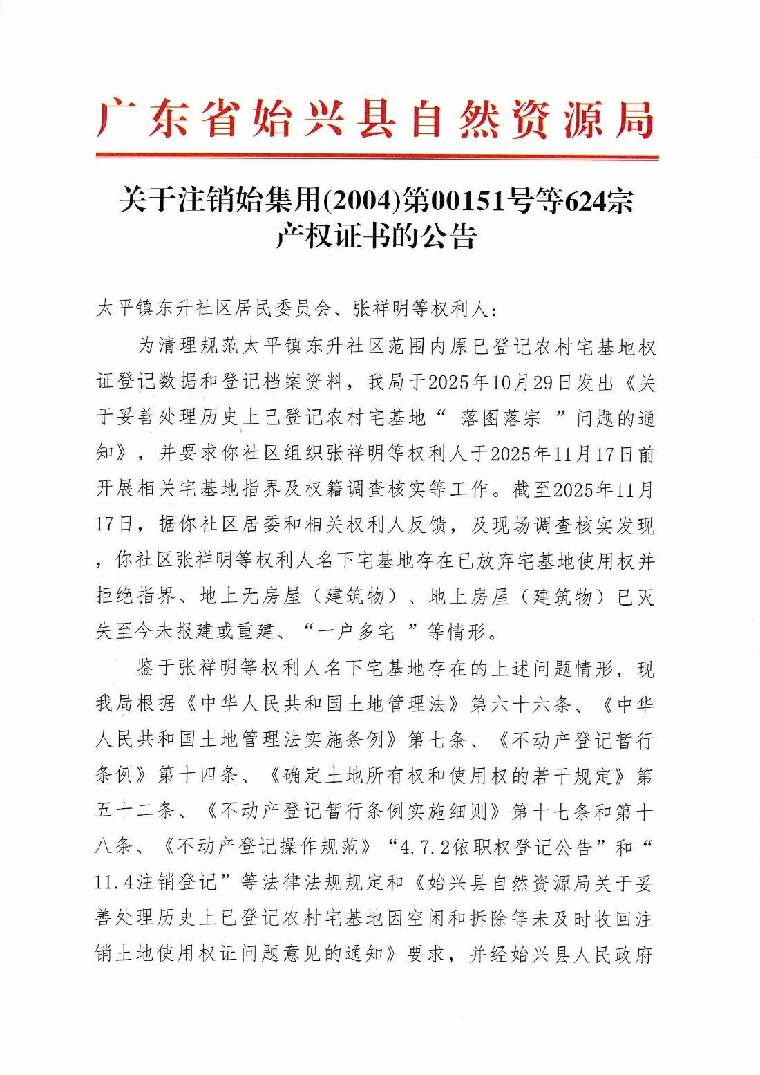 關于注銷始集用(2004)第00151號等624宗產權證書的公告