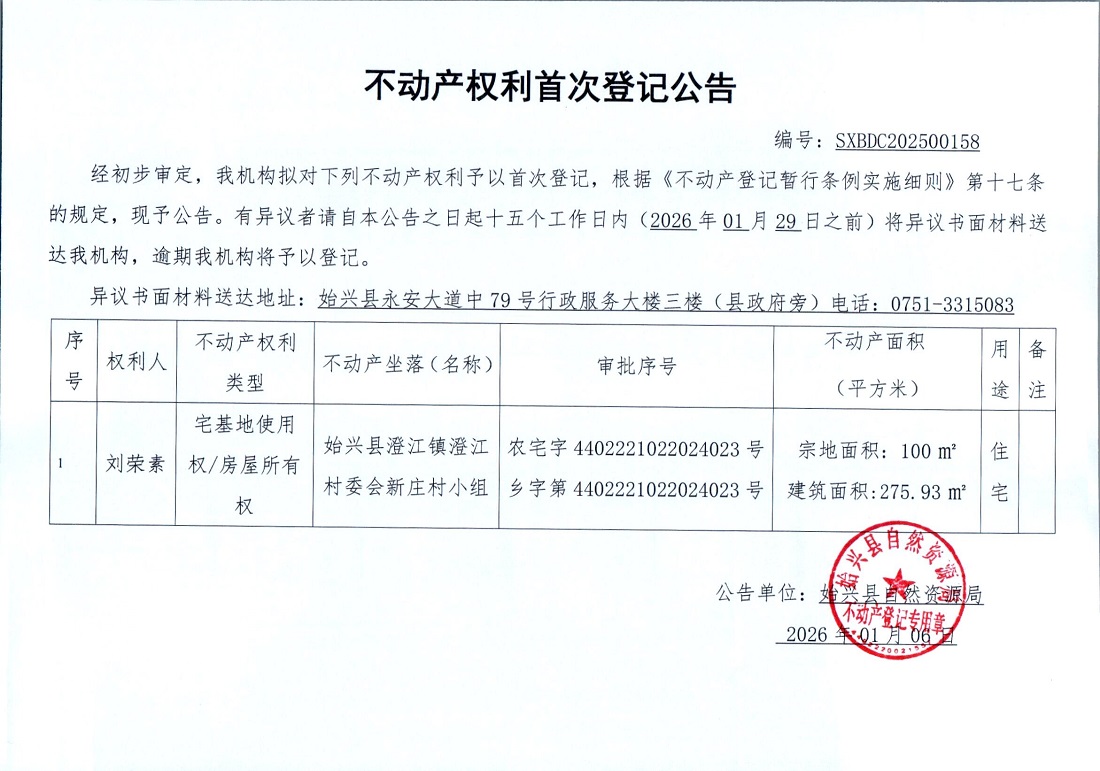 不動(dòng)產(chǎn)權(quán)利首次登記公告(劉榮素)
