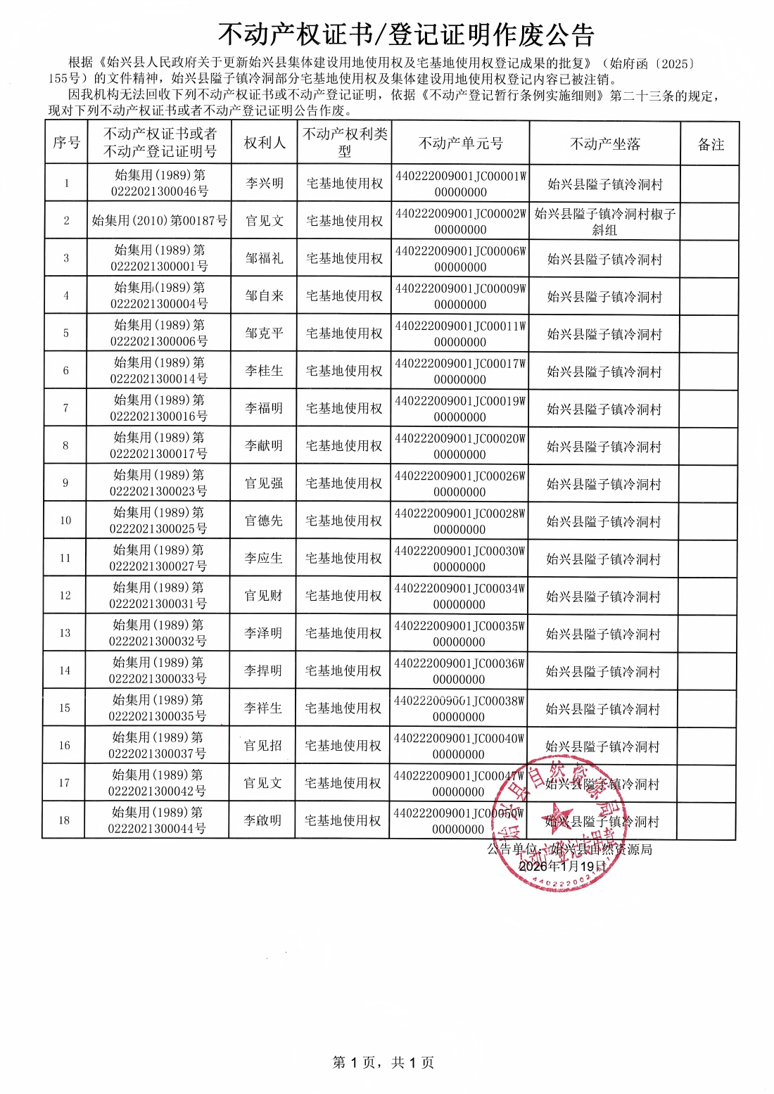 不動產權證書/登記證明作廢公告(隘子鎮冷洞村)