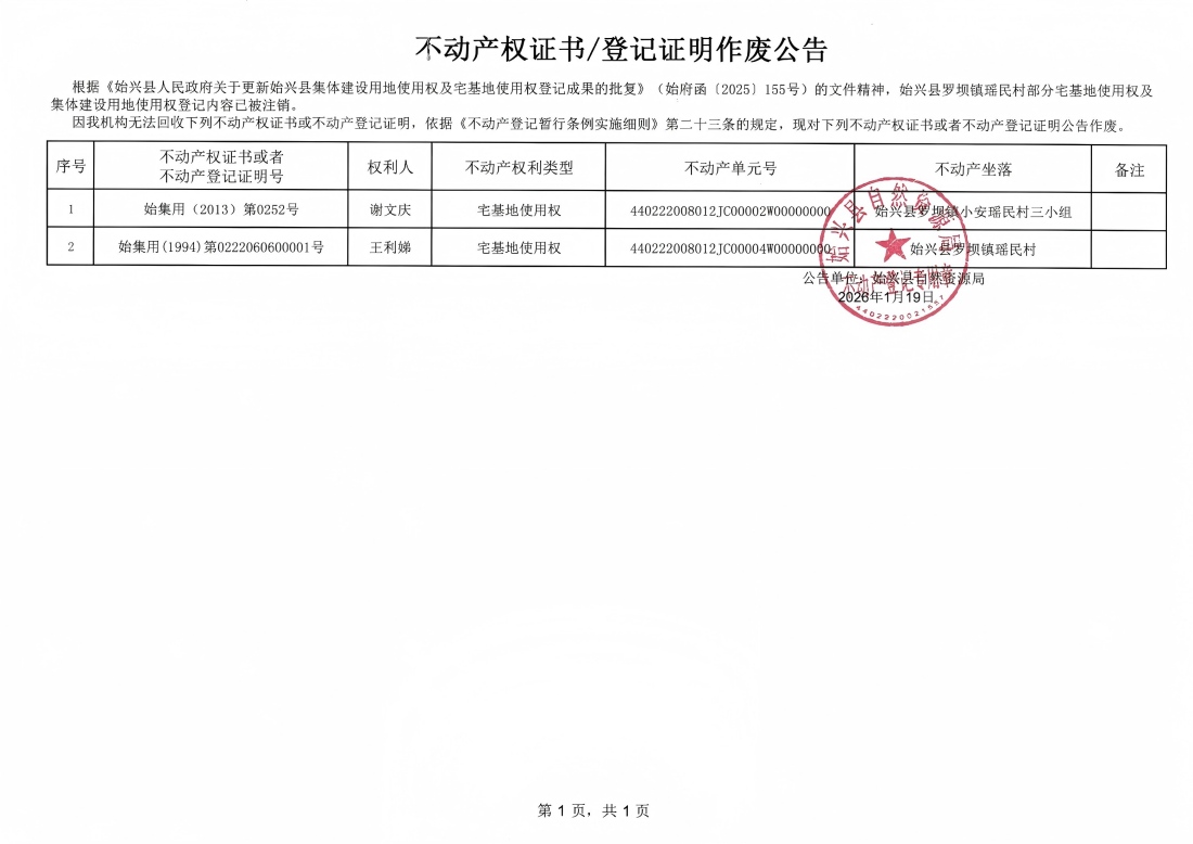 不動(dòng)產(chǎn)權(quán)證書/登記證明作廢公告(羅壩鎮(zhèn)瑤民村)
