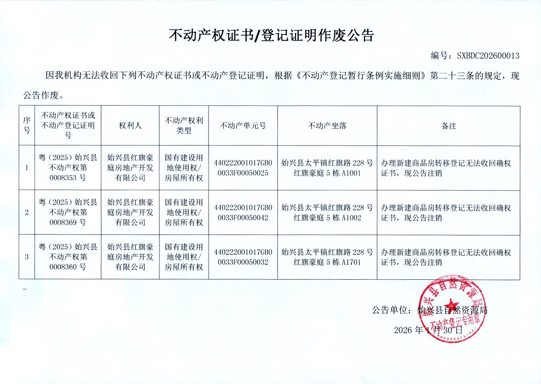不動產權證書/登記證明作廢公告(始興縣紅旗豪庭房地產開發有限公司)