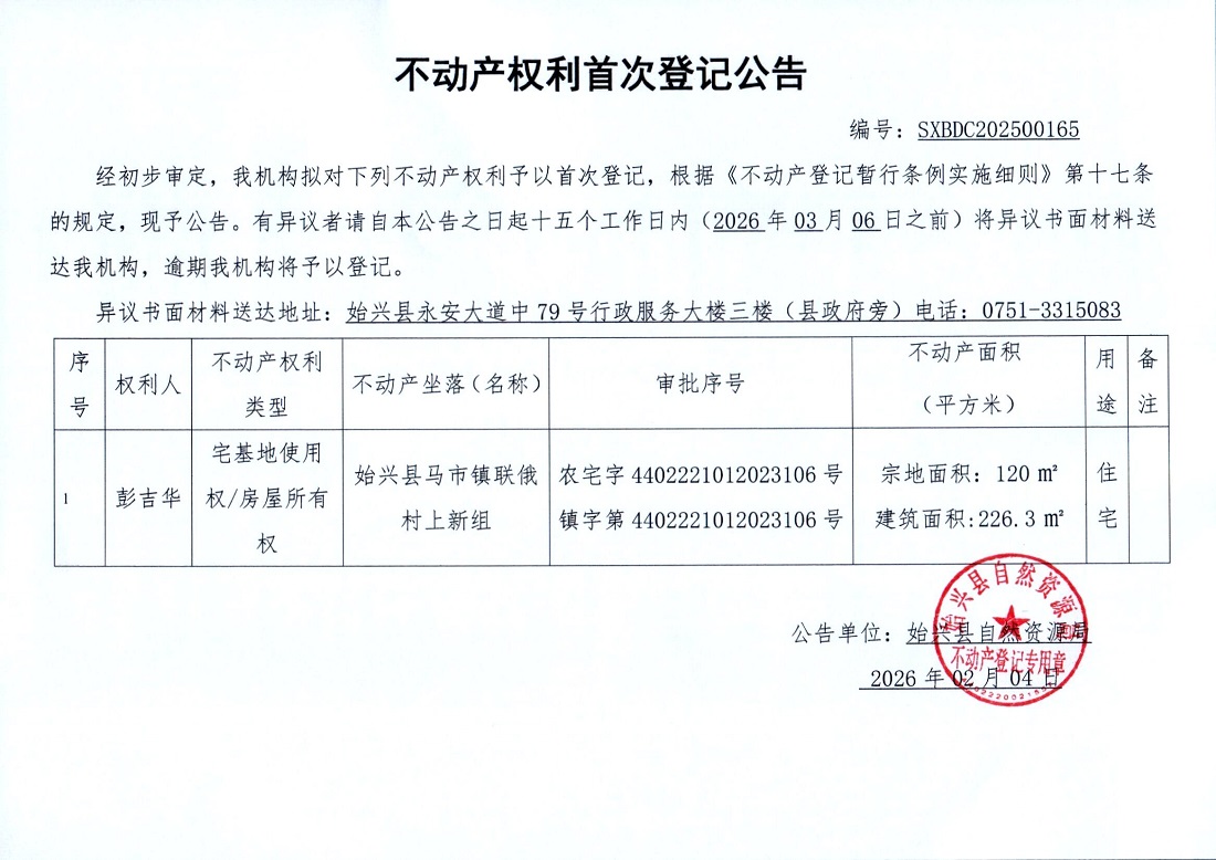 不產權利首次登記公告(彭吉華)